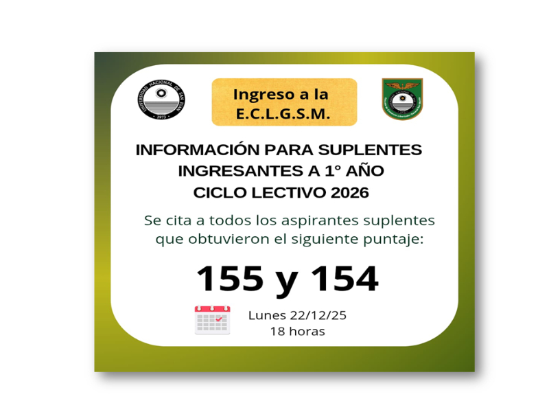 La Escuela de Comercio Libertador General San Martín informa que se abrirá la inscripción para completar vacantes disponibles de ingreso a 1º año en el turno intermedio. Podrán inscribirse únicamente los aspirantes suplentes aprobados con puntajes 155 y 154 inclusive.