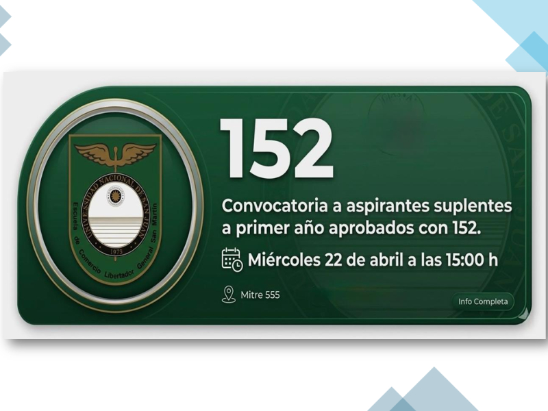 La Escuela de Comercio Libertador General San Martín comunica la apertura de inscripciones a 1º año en el turno intermedio para aspirantes suplentes que obtuvieron puntaje 152 .